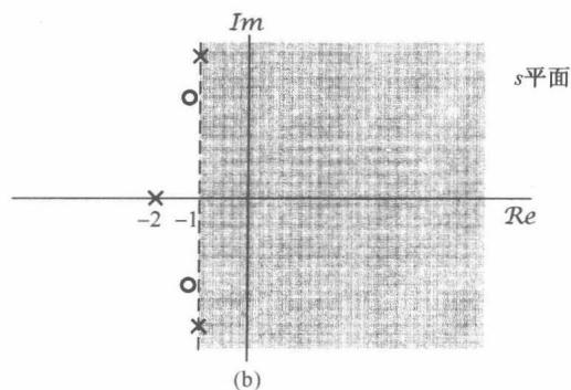 图9.2 (a)和(b)分别为9.3和例9.4的拉普拉斯变换的 平面表示。图中每一个 标出相应拉普拉斯变换的一个极点位置,也就是分母多项式的一个根的位置。同理,每个 标出一个零点,即分子多项式的一个根的位置。收敛域用阴影区指出