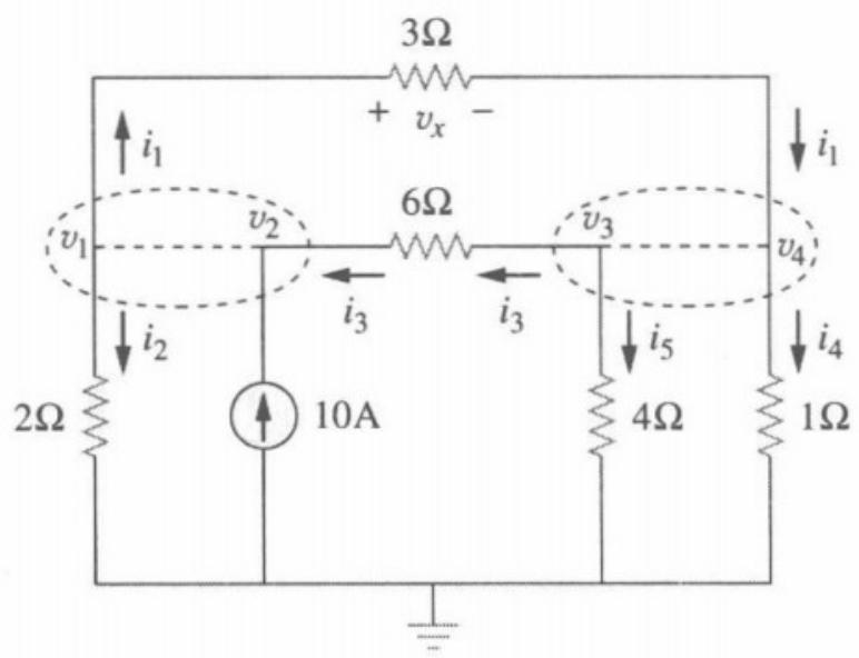 解: V1/2+(V1-V4)/3+(V2-V3)/6=10