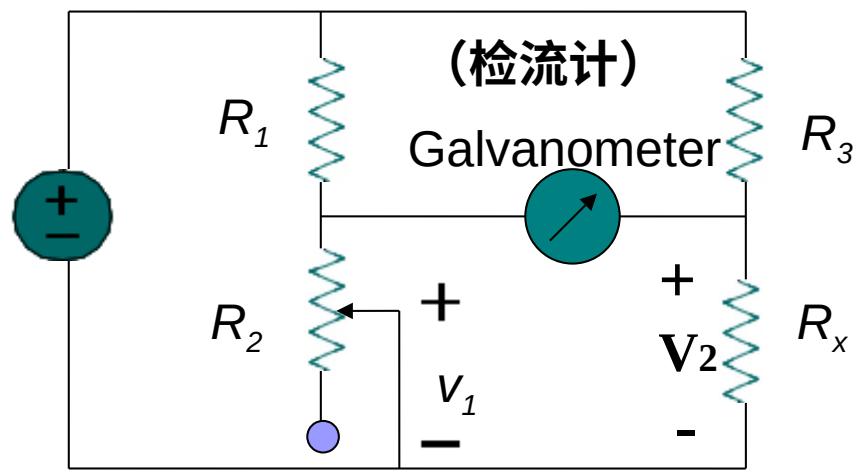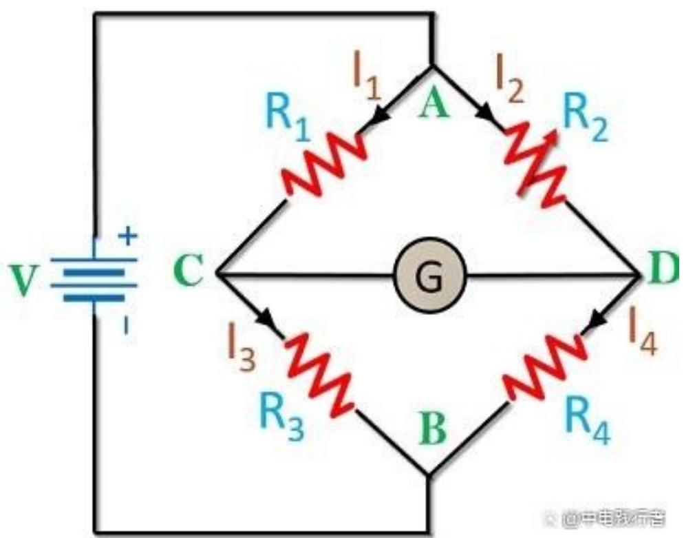 CD之间接入了一个检流计 G. 当 G 上检测到的电流为 0 时,CD 间开路,且Vc=Vd,(R1+R3)||(R2+R4)