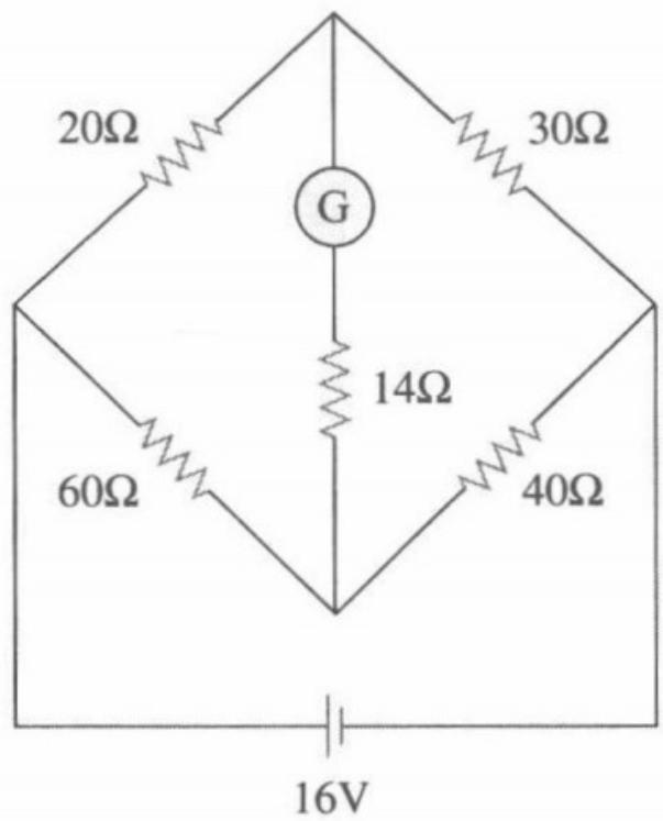 练习4-18在如图4-66所示的惠斯登电桥中,试求流经阻值为14Ω的检流计的电流。 答案:64mA