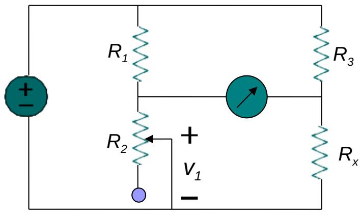 如图 4.63, R1 = 500Ω , R3 = 200Ω , 时,电桥平衡。确定未知电阻 的值。