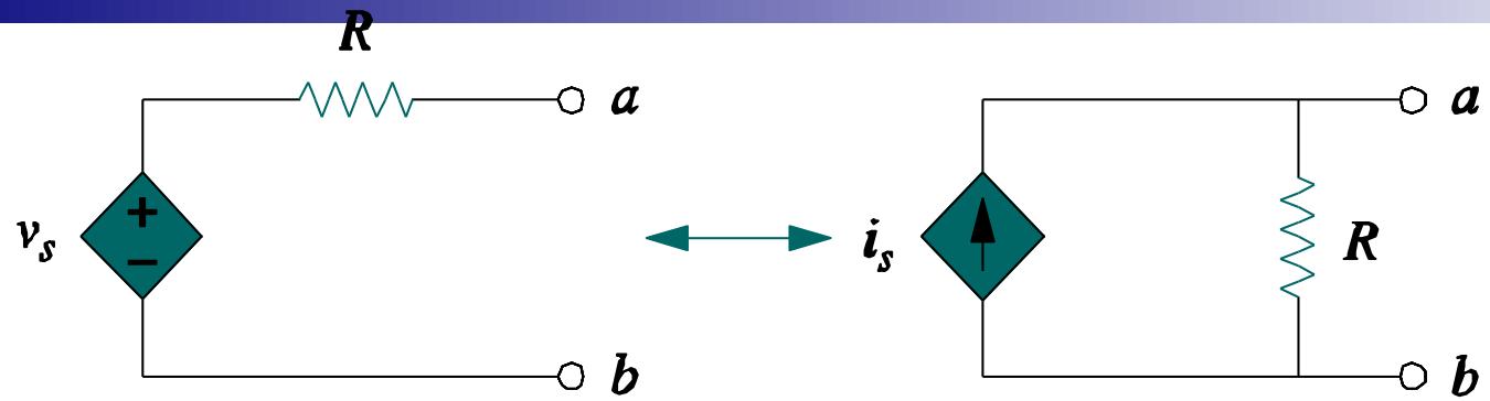 戴维南定理和诺顿定理允许我们将电路网络中的一部分孤立,而将网络的其余部分用一个等效网络来替代。戴维南等效电路由一个电压源 串联电阻 组成,而诺顿等效电路由一个电流源 并联电阻 组成。这两个定理是由电源变换联系起来的。V