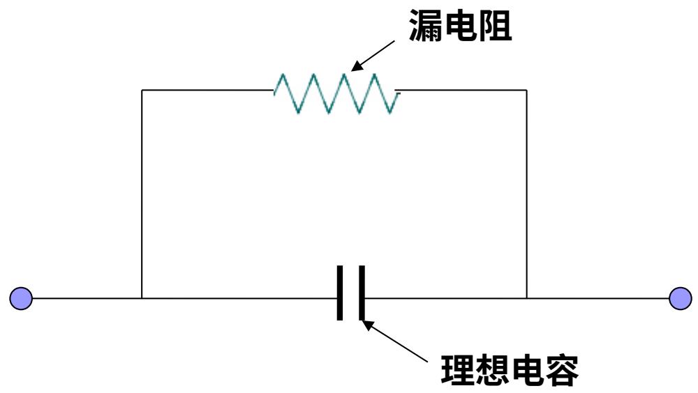 实际电容有一个并联模式的漏电阻 , 如下图。