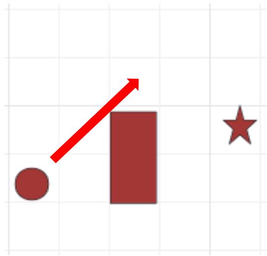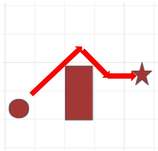 练习2 某探险队需绕过湖到达露营地,地图由方格组成(如右图所示),湖面为不可穿越的障碍区。探险队可向上下左右或对角线移动(水平和垂直移动成本为10,对角线为15)。使用A*算法测绘最终到达目的地的最近行走距离。(探险队、湖面、露营地分别为图中圆形、矩形、星形)