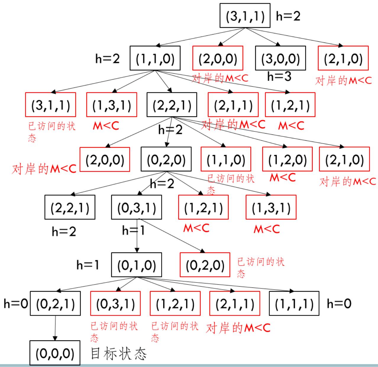 ◼ 状态 (M, C, B) 表示:M – 左岸的传教士的人数,C –左岸的野蛮人的人数, 表示小船在河的左岸