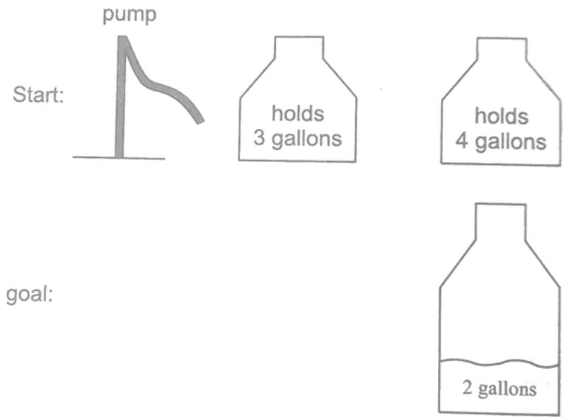 We have a 3 gallon (liter) jug and a 4 gallon jug. We can filleither jug to the top from a tap, we can empty either jug, orwe can pour one jug into the other (at least until the otherjug is full).
