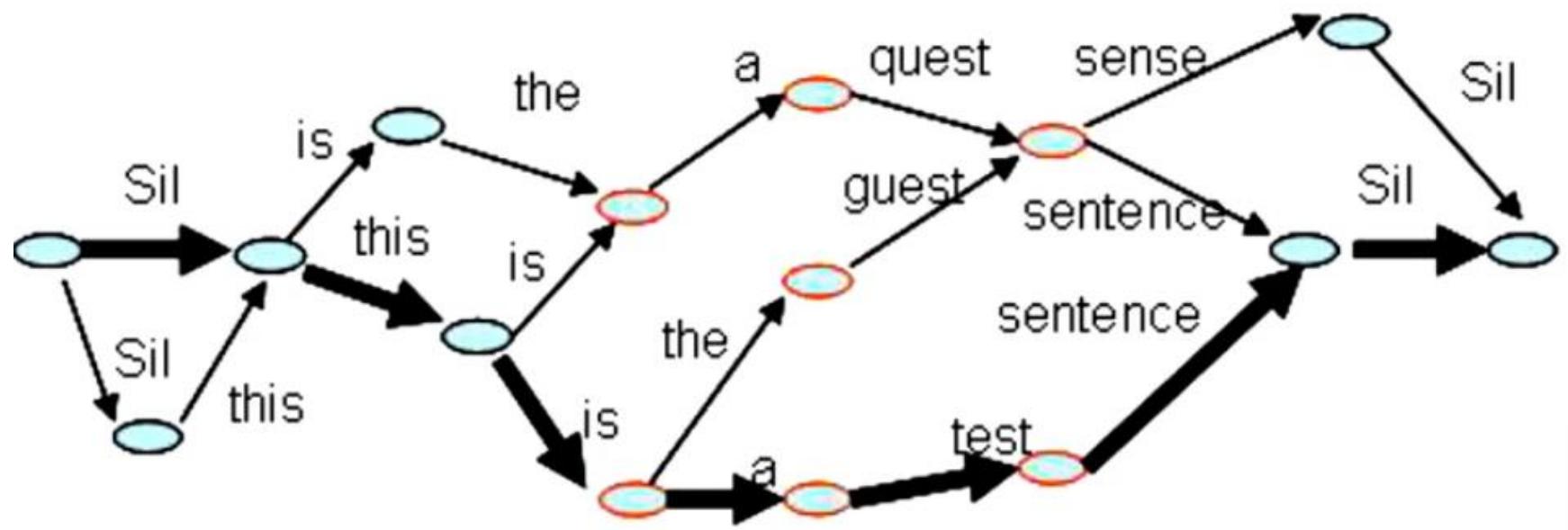 在统计语音识别过程中,计算机将用户的每个发音转化成若干可能的词,构成如下的词图(比如sense、sentence)。语音识别的任务就是要在这样的词图中寻找最有可能组成合理句子的组合。