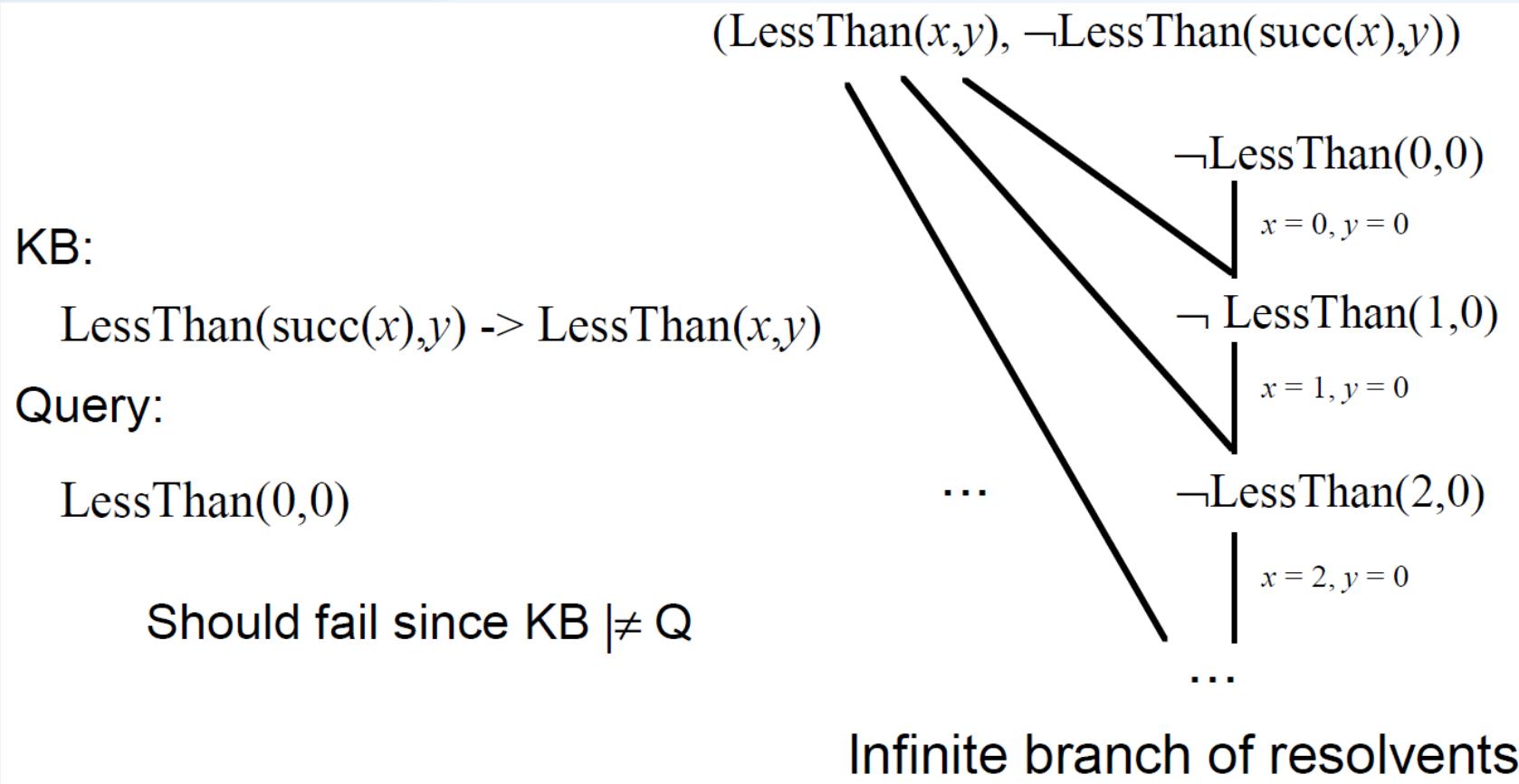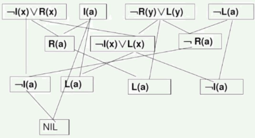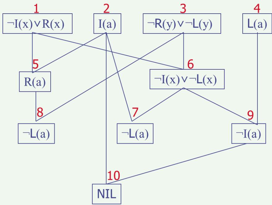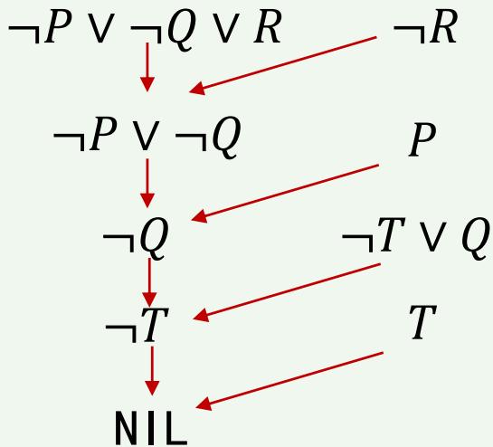 • 限制:参加归结的两个子句中必须至少有一个是单文字子句。