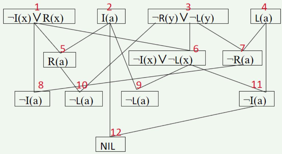 设有子句集 ,其中¬I(x)∨R(x)是目标公式否定后得到的字句。