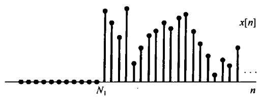 其中 是有限值,可以正也可以负。如果 是负的,那么式(10.26)的和式中将包括 的正幂次项,这些项将随 而变成无界的。因此,一般来说,右边序列的收敛域不包括无限远点。然而,对于因果序列,即 时序列值为零的序列, 一定为非负,因此收敛域一定包括 。