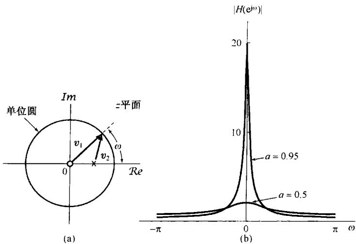 可以看到,式(10.9)的 变换是一个有理函数。当然,和拉普拉斯变换一样, 变换也能够用它的零点(分子多项式的根)和极点(分母多项式的根)来表示。对于这个例子,有一个在 的零点和一个在 的极点,当 为0和1之间的某个值时,例10.1的零-极点图和收敛域如图10.2所示。若 ,则收敛域不包括单位圆;这一点与下述事实是一致的:当 时, 的傅里叶变换不收敛。