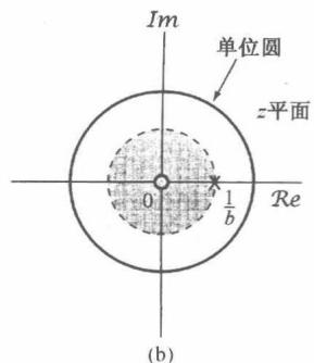为了保证 收敛,式(10.19)中的两个和式都必须收敛,这就要求 并且 ,或等效为 。这个例子的零-极点图和收敛域如图10.5所示。