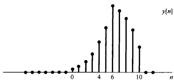 在求 时仅涉及两个单位脉冲响应的移位和加权的结果,即 和 两个序列,它们分别示于图2.3(b)。在每个 值上相加这两个序列就得到 ,如图2.3(c)所示。