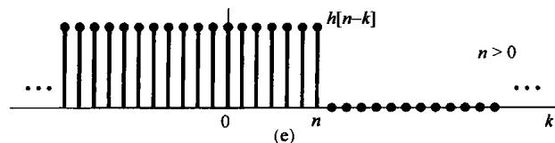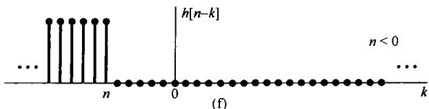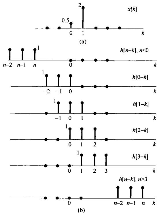 图2.4 对于图2.3中信号 和 ,式(2.6)的说明。(a)信号 ;(b)将 看成固定 时 的函数,对于几个 值 时的信号 ,这些信号都是由 的反转和移位来得出的。对每个 值的 是将图(a)中的 与图(b)中的 相乘,然后在全部 值上将乘积相加后得出的。这个例子的计算在例2.2中已详细做过