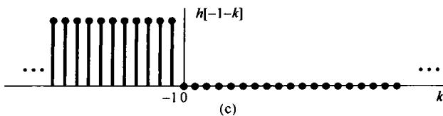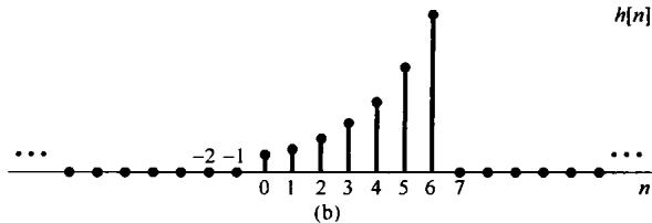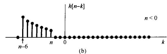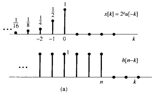 例2.2 重新考虑例2.1中的卷积问题。序列 示于图2.4(a);而序列 看成固定 时 的函数,对于几个不同的 值的序列示于图2.4(b)。在画这些序列时已经用到了这一点,就是 是单位脉冲响应 的时间反转与移位。随着 的增加,宗量 减小,这就说明了需要对 进行一个时间反转。知道了这一点,为了画出信号 ,仅仅需要确定对某个特定 值的 值就够了,例如,在 时,宗量 等于0。于是,如果画出了信号 ,只是将它右移 时),或左移 时),就得到了信号 。图2.4(b)画出了 和 时的结果。