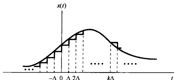 与上一节讨论并导出的结果相类似,这一节的目的也是要利用一个连续时间线性时不变系统的单位冲激响应来对系统给出完全的表征。在离散时间情况下,导出卷积和的关键是离散时间单位脉冲的筛选性质,这就是把一个信号作为一组加权并移位的单位脉冲函数叠加的数学表示式。这样一来,直观上看也就能把离散时间系统当成对这一串单个脉冲的响应。当然,在连续时间情况下没有一个离散的输入序列。然而,正如1.4.2节所讨论的,如果把单位冲激看成它的持续期短到对任何实际物理系统已毫无意义的一个短脉冲理想化的结果,那么就能够利用这些持续期小到难以察觉的理想化脉冲,即冲激,来表示任何连续时间信号。下面将导出这种表示,并接着用与2.1节类似的方式来建立连续时间线性时不变系统的卷积积分表示。