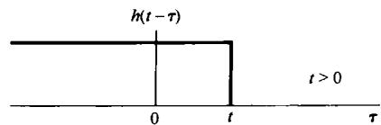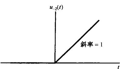 其中 。图2.5中画出了这两个信号。为了帮助我们想象并计算这两个信号的卷积,在图2.6中已经画出了 , , 和 (也就是 和 时的 ),以及最后对任意正 和负 值时的 。由这个图可知,对于 , 和 的非零部分没有任何重合,所以对于 而言, 对于所有的 值都为零,由式(2.6)可知 时 。对于