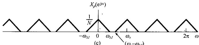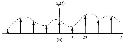图7.10 利用sinc函数的理想带限内插。(a)带限信号 ;(b) 的样本冲激串;(c)用式(7.11)的sinc函数的叠加取代冲激串的理想带限内插