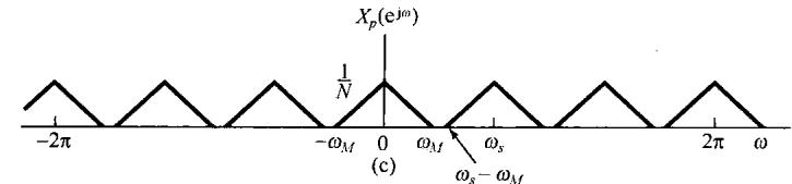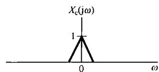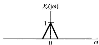 在频域来考察图7.19的处理过程也是很有启发意义的。由于我们面临着既要在连续时间又要在离散时间处理傅里叶变换,因此仅在这一节将连续时间的频率变量用 表示,将离散时间的频率变量用 表示,以便加以区分。例如, 和 的连续时间傅里叶变换分别用 和 表示;而 和 的离散时间傅里叶变换分别用 和 表示。