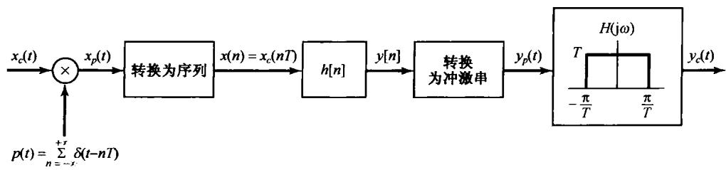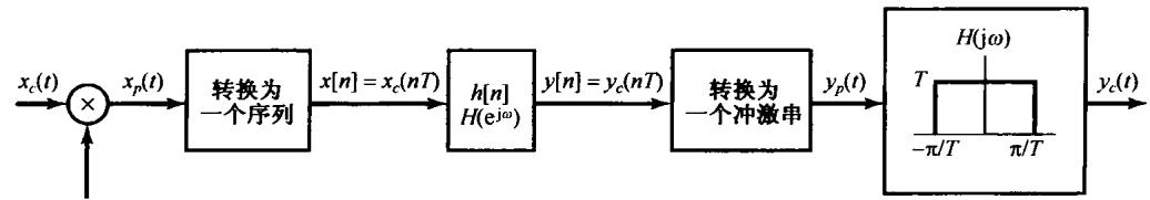 广而言之,对连续时间信号的这种处理方法可以看成图7.19所示的三个环节的级联,其中 和 都是连续时间信号,而 和 都是对应于 和 的离散时间信号。当然,就图7.19的整个系统而言,仍是一个连续时间系统,因为系统的输入和输出都是连续时间信号。将一个连续时间信号转换为一个离散时间信号,以及从信号的离散时间表示重建连续时间信号所依据的理论基础,都是7.1节讨论的采样定理。通过这样一个周期采样的过程(其采样频率满足采样定理中的条件),连续时间信号 就可以完全用一串瞬时样本值 来表示;也就是说,离散时间序列 以下式