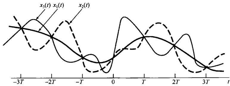 图7.1 在 的整倍数时刻点上具有相同值的三个连续时间信号