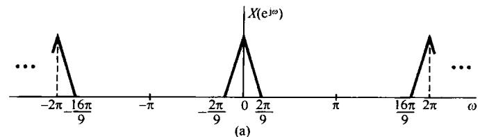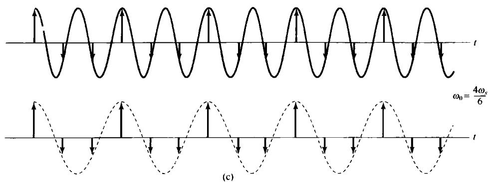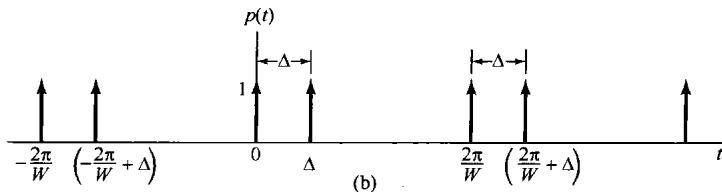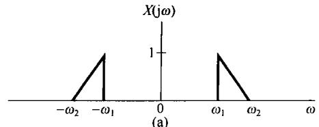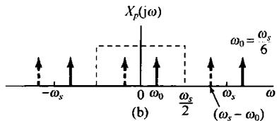 在这种情况下, 的傅里叶变换基本上与图7.15(a)是相同的,只是现在用实线标出的冲激有一个幅度因子 ,而用虚线标出的冲激,其幅度因子有一个相反的相位,即 。如果现在考虑用与图7.15所选的同一组 值,那么得到的 的已采样信号的频谱与该图也是一样的。只是所有的实线冲激都有 的幅度因子,而所有的虚线冲激都有 的幅度因子。再者,在图7.15(b)和图7.15(c)情况下,采样定理中的条件满足,所以 ;而在图7.15(d)和图7.15(e)情况下,再次发生混叠。然而,现在可以看到,出现在低通滤波器通带内的实线冲激和虚线冲激在位置上发生了颠倒,结果发现在这些情况下, ,这里在相位中的符号上有一个改变,即有一个相位倒置(phase reversal)。