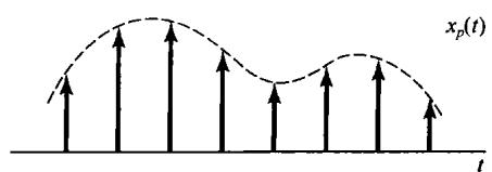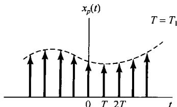 由1.4.2节曾讨论过的单位冲激函数的采样性质可知, 被一个单位冲激函数相乘以后就将冲激发生的这一点的信号值采出来,即 。将此应用于式(7.1),如图7.2所示,可见 本身就是一个冲激串,其冲激的幅度等于 在以 为间隔处的样本值,即