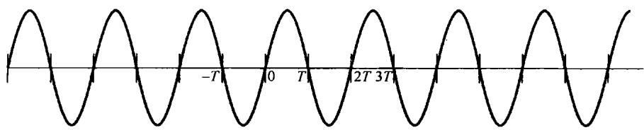 这个信号如图7.17所示。可见该信号在采样周期 整倍数点上的值都是零。因此,在这个采样率下所产生的信号全是零;当这个零输入加到该理想低通滤波器上时,所得输出 当然也都是零。