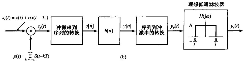 7.41 在许多实际场合,是在有回波的情况下记录信号的,因而希望通过适当的处理消除这些回波。例如,图P7.41(a)示意了一个系统,在该系统中接收机同时接收到信号 和一个回波,该回波是用衰减并延迟了的 来表示的。于是,接收机的输出是 ,其中 。为了恢复 ,先将 变换成一个序列,并用合适的数字滤波器 对接收机的输出进行处理,如图P7.41(b)所示。