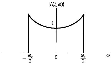 所示。由一个零阶保持系统的输出来重建 仍然可以用低通滤波的办法来实现。然而,在这一情况下,所要求的滤波器特性不再是在通带内具有恒定的增益。为了求得所要求的滤波器特性,首先注意到这个零阶保持的输出 在原理上可以用冲激串采样,再紧跟着一个线性时不变系统(该系统具有矩形的单位冲激响应)来得到,如图7.6所示。为了由 重建 ,可以考虑用一个单位冲激响应为 ,频率响应为 的线性时不变系统来处理 。这个系统与图7.6的系统级联后如图7.7所示,这里希望给出一个 ,以使 。把图7.7的系统与图7.4的系统比较一下,可以看出,如果 与 级联后的特性是在图7.4中所用的理想低通滤波器 的特性,那么 。因为根据例4.4和4.3.2节的时移性质,有