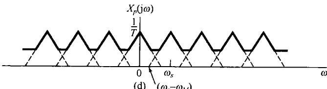图7.3 时域采样在频域中的效果。(a)原始信号频谱;(b)采样函数的频谱;(c) 时已采样信号的频谱;(d) 时已采样信号的频谱