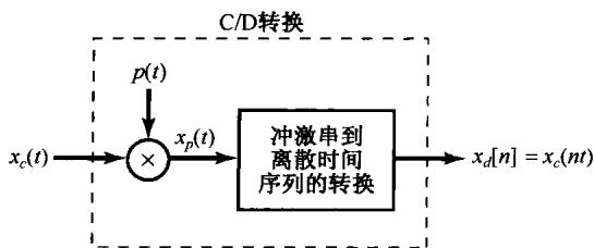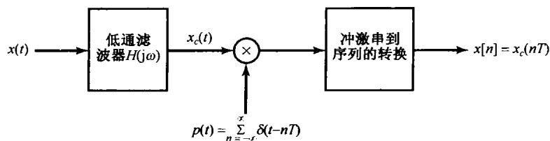 为了进一步明了连续时间信号 和它的离散时间表示 之间的关系,可以把从连续时间到离散时间的变换表示成一个周期采样的过程,再紧跟着一个把冲激串映射为一个序列的环节,这样做是非常有益的。这两步都表示在图7.21中。图中的第一步代表一个采样过程,冲