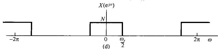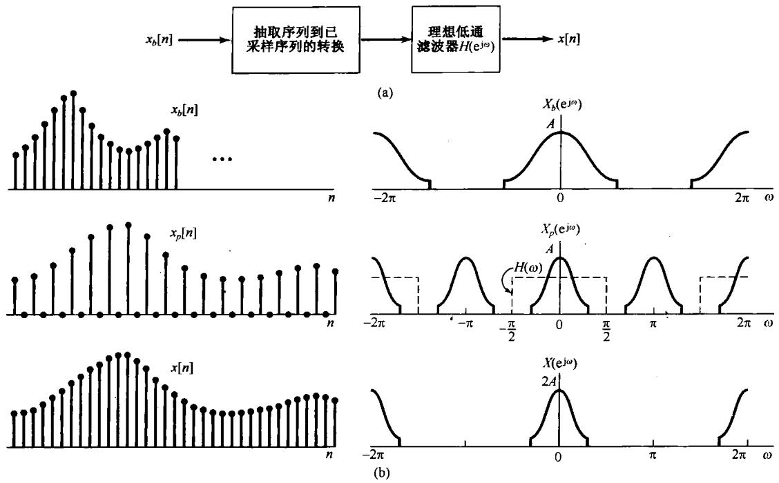 激串 就是一个冲激序列,各冲激的幅度与 的样本值相对应,而在时间间隔上等于采样周期 。然后,在从冲激串到离散时间序列的转换中,得到 ;这就是以 的样本值为序列值的同一序列,但是其单位间隔采用新的自变量 。因此,实际上从样本的冲激串到样本的离散时间序列的转换可认为是一个时间的归一化过程。图7.21(b)和图7.21(c)明确地表示了由 到 的转换中这种时间的归一化过程。在这里, 和 分别以 和 的两种采样率表示。