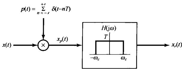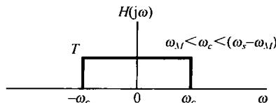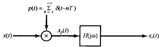 已知这些样本值,我们能用如下办法重建 :产生一个周期冲激串,其冲激幅度就是这些依次而来的样本值;然后将该冲激串通过一个增益为 ,截止频率大于 而小于 的理想低通滤波器,该滤波器的输出就是 。