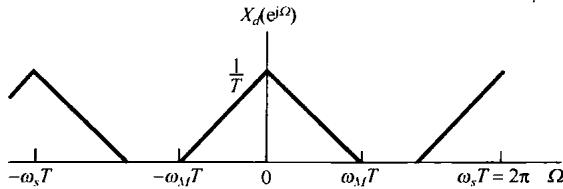 在前面的讨论中都假定采样频率足够高,因而满足采样定理中的条件。正如在图7.3中所说明的,当 时,采样信号的频谱是由 的频谱重复组成的,而这正是采样定理的基础。当 时, 的频谱 不再在 中重复,因此利用低通滤波也不再能把 从采样信号中恢复出来。这时,式(7.6)中的那些单项发生重叠,这一现象称为混叠(aliasing)。本节将讨论它的影响和一些结果。