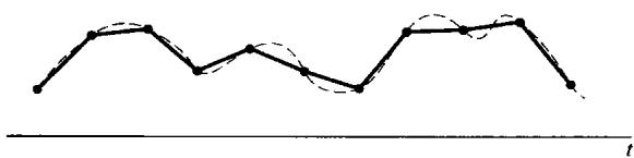 图7.9 样本点之间的线性内插。虚线代表原始信号,实线就是线性内插