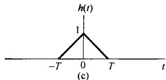 如果由零阶保持所给出的粗糙内插令人不够满意,则可以使用各种更为平滑的内插手段,其中的一些合起来统称为高阶保持(higher order hold)。特别是,零阶保持产生的图7.5所示的输出信号是不连续的;而与此相比,图7.9所示的线性内插产生的恢复信号是连续的,但由于在各样本点上斜率的改变而导致导数是不连续的。线性内插(有时也称一阶保持)也能看成一种如图7.4和式(7.9)形式的内插,不过 为三角形特性,如图7.13所示。其传输函数 也如图7.13所示,并且