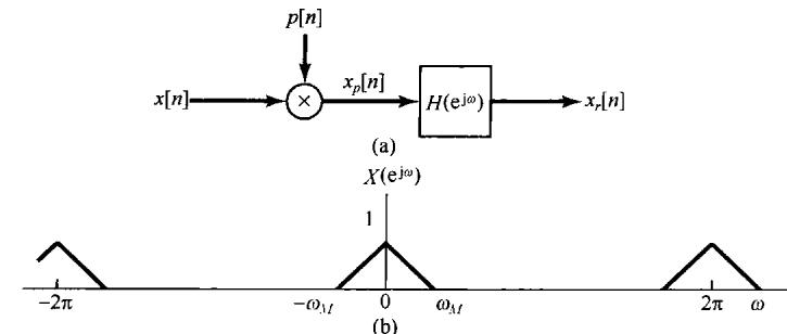 设 为一序列,按图7.31所指出的对它进行离散时间采样。假定满足离散时间采样定理中的条件,即 ,这里 是采样频率,并且有 , 。那么,原信号 就可用理想低通滤波器由 完全恢复,这如同在7.5节中所讨论的相应于带限内插。