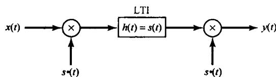 更为简单一些,并且和复指数载波一样有效。事实上,使用正弦载波就相应于仅仅保留图8.2所示系统中输出的实部或虚部部分,这样的系统如图8.3所示。