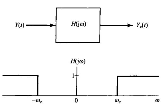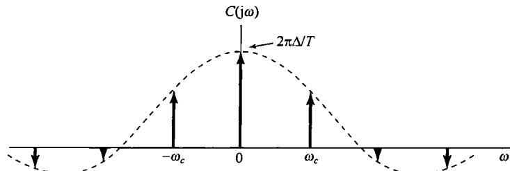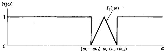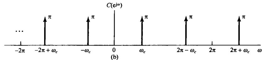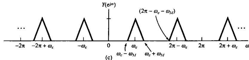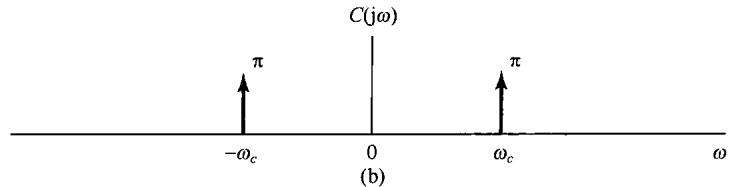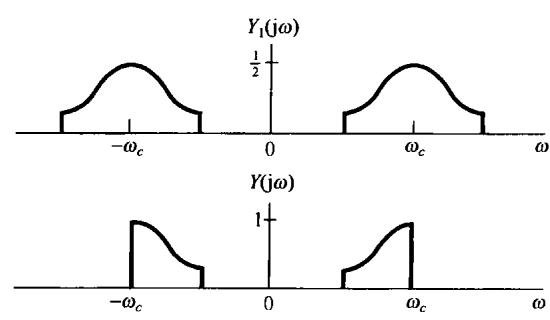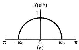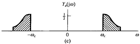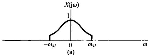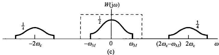 图8.6中示出了 和 的频谱,并看到 可以用一个增益为2,截止频率大于 而小于 的理想低通滤波器从 中恢复出来。该低通滤波器的频率响应在图8.6(c)中用虚线示出。