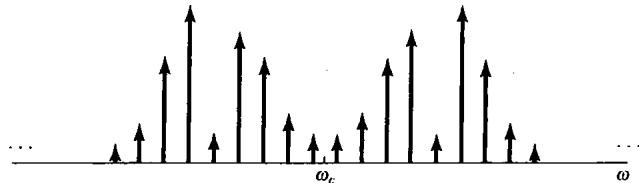 用式(8.2)所示的正弦载波来进行幅度调制的效果也可以采用与8.1.1节相同的方法进行分析。为方便起见,再次选 。这一情况下,载波信号的频谱是