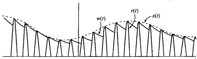 图8.11 用包络检波解调。(a)利用半波整流的包络检波器电路;(b)与图(a)有关的波形。 是半波整流信号, 是真正的包络,而 是从图(a)中电路得到的包络。为了说明问题,图(b)中 和 之间的差别已经夸大了。在一个实际的非同步解调系统中, 是非常接近于 的