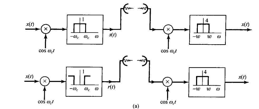 这样,低通滤波器的输出就是 乘以振幅因子 。如果调制器和解调器中的振荡器是同相位的,即 ,那么低通滤波器的输出就是 。另一方面,如果这些振荡器有 的相位差,则输出就是零。一般来说,为了获得最大的输出信号,振荡器应该同相。更为重要的是,这两个振荡器之间的相位关系必须在全部时间内保持不变,以使振幅因子 不变。这就要求在调制器和解调器之间准确地同步,这一点往往是困难的,特别是在通信系统中,一般调制和解调总是被分隔在两个不同的地点。同步的需要和相应的影响不仅存在于调制器和解调器的相位之间,而且还存在于两者所用的载波频率之间。关于这两点将在习题8.23中详细讨论。
