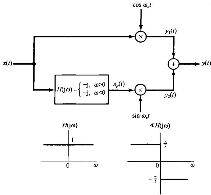 有几种方法可以获得单边带信号。一种方法是应用一个锐截止的带通或高通滤波器,滤掉图8.19(b)中不需要的边带,如图8.20所示。第二种方法是采用移相技术来滤掉一个边带而保留另一个边带。图8.21就是一个用于保留下边带的这种系统。该图中的 称为“ 相移网络”,其频率特性为