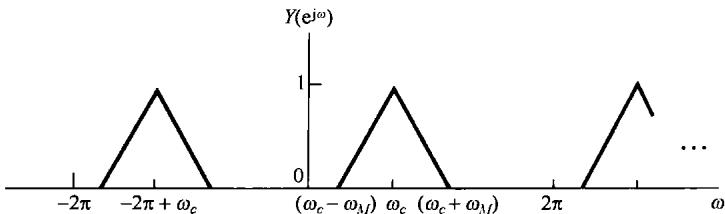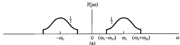 图8.3 正弦载波的幅度调制 若 如图8.4(a)所示,则 的频谱如图8.4(c)所示。从图中可以注意到,以 和 为中心都有一个原始信号频谱形状的重复。结果只要 ,就能从 中恢复出 ;否则,这两个重复的频谱将会有重叠。与复指数载波的情况相比,在那里原始信号频谱形状的重复仅在 附近出现,因此,正如在8.1.1节所看到的,在以复指数为载波的幅度调制中,对任意选取的 ,总是可以按式(8.7)采用乘以 ,将频谱移回到它原来位置的办法,将 从 中恢复出来。另一方面,用正弦载波,如果 ,由图8.4可见, 的两个重复的频谱之间将会有重叠。例如在图8.5中, 时的 就是那样。很明显,这时 的频谱不再在 中重复原样,因此也就不再可能从 中将 恢复出来。