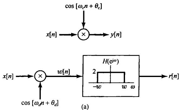8.47 在 8.8 节中讨论了正弦载波时的同步离散时间调制和解调系统。本题要研究当相位和/或频率失去同步时的影响。图 P8.47(a) 示出了这个调制和解调系统,图中都指出了调制器和解调器载波之间的相位差和频率差。设频率差 记为 ,相位差 记为 。