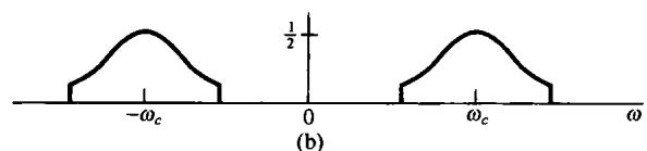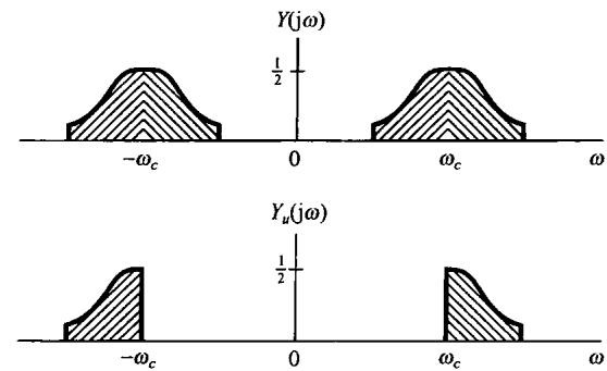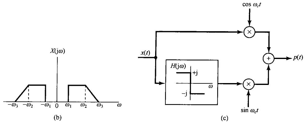 在8.1节讨论的正弦幅度调制系统中,原始信号 的总带宽是 ,既包括正的频率部分,又包括负的频率部分,其中 是 中的最高频率。利用复指数载波,这个频谱被搬到 上,虽然已调信号现在是复数的,但占有信号能量的总的频带宽度仍是 。利用正弦载波,信号的频谱搬移到 和 上,因此要求2倍于前面的频带宽度。这意味着利用正弦载波,在已调信号中有冗余度,利用一种称为单边带调制(single-sideband modulation,SSB)的技术,可以把这个冗余度除掉。