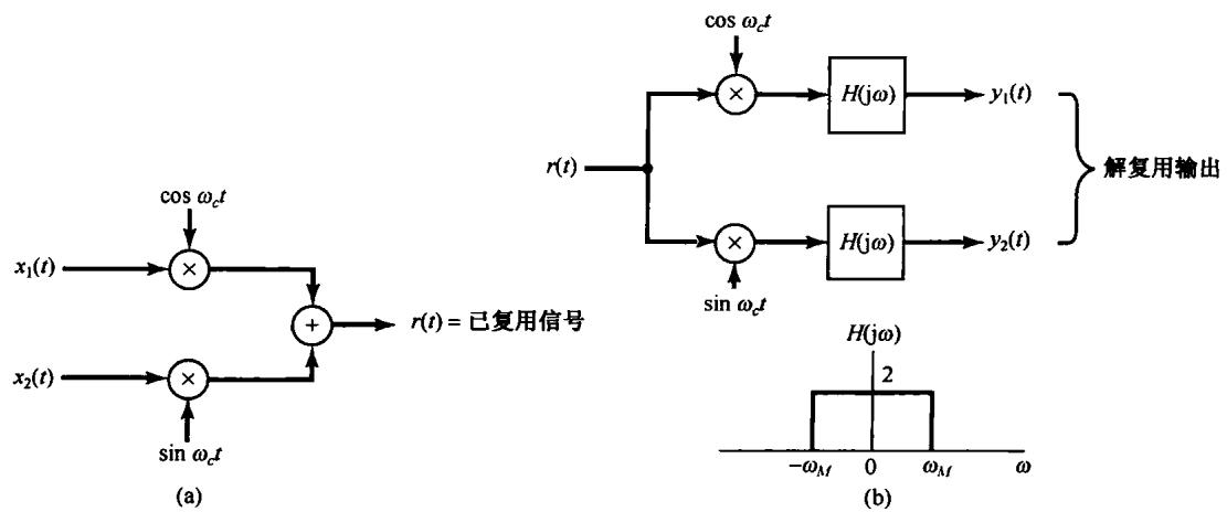 8.40 在 8.3 节中曾讨论过利用正弦幅度调制实现频分多路复用,借以把几个信号搬移到不同的频带上,然后把它们加起来同时发送出去。本题将研究另一种称为正交多路复用(quadrature multiplexing)的概念。按此多路复用方法,如果两个载波信号的相位相差 ,那么这两个信号可以同时在同一频带内传送。该多路复用系统如图 P8.40(a) 所示,其解复用系统如图 P8.40(b) 所示。