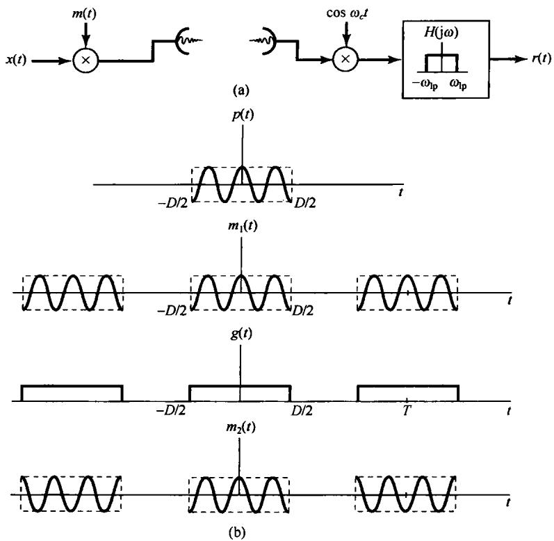 8.38 图P8.38(a)示出一种通信系统,该系统把一个带限信号 转换为周期性高频能量脉冲来发射。假定 , ,对调制信号 有两种可能的选择,分别用 和 来表示,其中 是周期性的正弦脉冲串,每个脉冲的持续期为 ,如图P8.38(b)所示,即