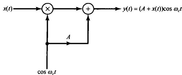 正如在8.0节所讨论的,调制的一个重要目的就是产生一个信号,该信号的频率范围适合于在所用的通信信道上传输。例如,在电话传输系统中,长距离传输往往是在微波或卫星中继通信系统中完成的。单个声音信号在 到 的频率范围内,而微波中继则要求信号在 到 的范围内,卫星中继通信工作在从数百兆赫到 的频率范围内。因此,要在这些信道上传输以声音信号表示的信息,就必须将其搬移到这些较高的频率范围中去。本节将看到,正弦幅度调制可用很简单的方式来完成这样的频率搬移。